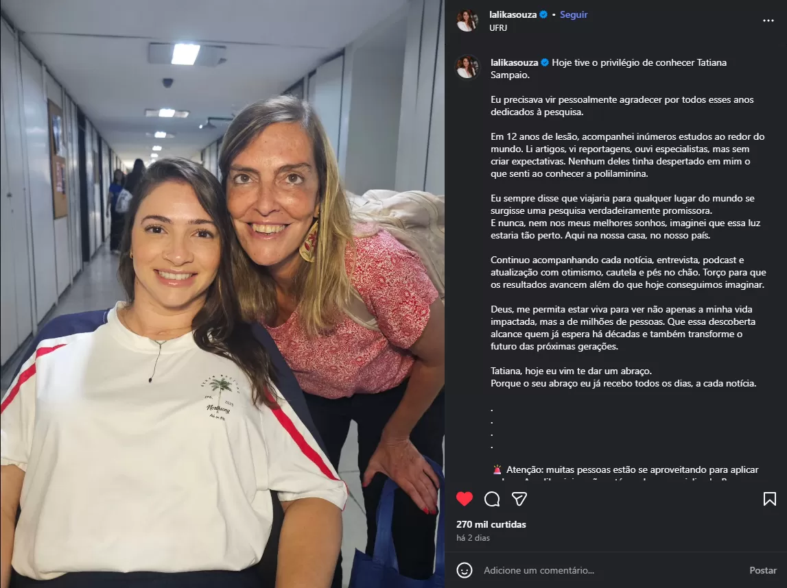 Laís viajou especialmente ao Rio de Janeiro para agradecer pessoalmente à pesquisadora pelos anos dedicados à ciência. "Hoje tive o privilégio de conhecer Tatiana Sampaio. Eu precisava vir pessoalmente agradecer por todos esses anos dedicados à pesquisa. Em 12 anos de lesão, acompanhei inúmeros estudos ao redor do mundo, mas nenhum deles tinha despertado em mim o que senti ao conhecer a polilaminina", declarou a atleta em suas redes sociais.