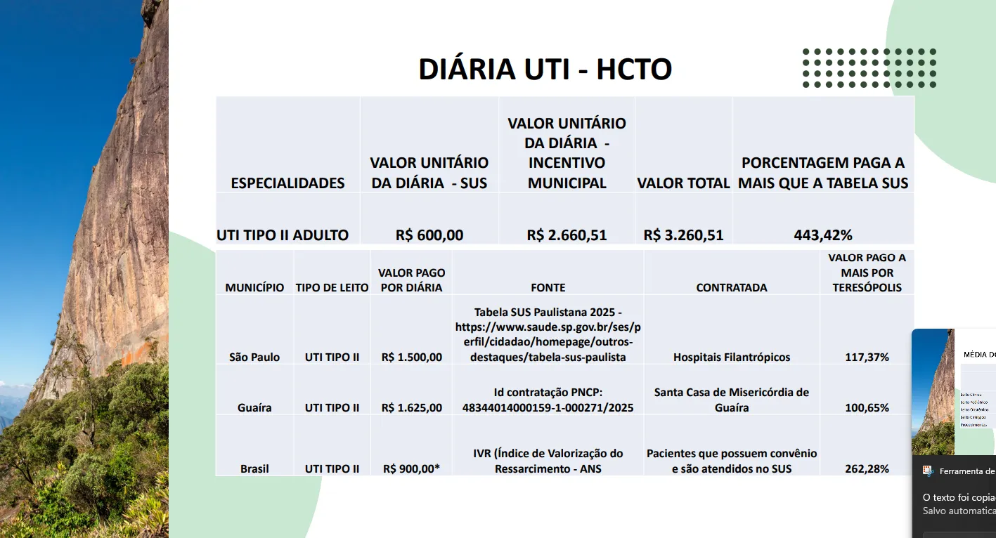Os números não se limitam à UTI. Um leito clínico, por exemplo, tem valor total de R$ 7.230,04 em Teresópolis — quase o dobro da tabela federal. Já o leito pediátrico chega a custar R$ 4.856,19, o que representa mais de 600% acima do valor base. O leito obstétrico segue a mesma linha, com custo final de R$ 3.979,84. Lembrando que todos esses preços já incluem o complemento feito com recursos próprios do município.